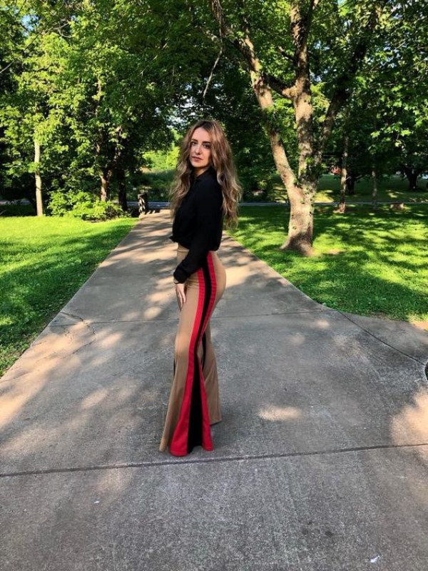 Black long-sleeve crop top paired with high-waisted beige pants featuring red side stripes, suitable for casual outings.